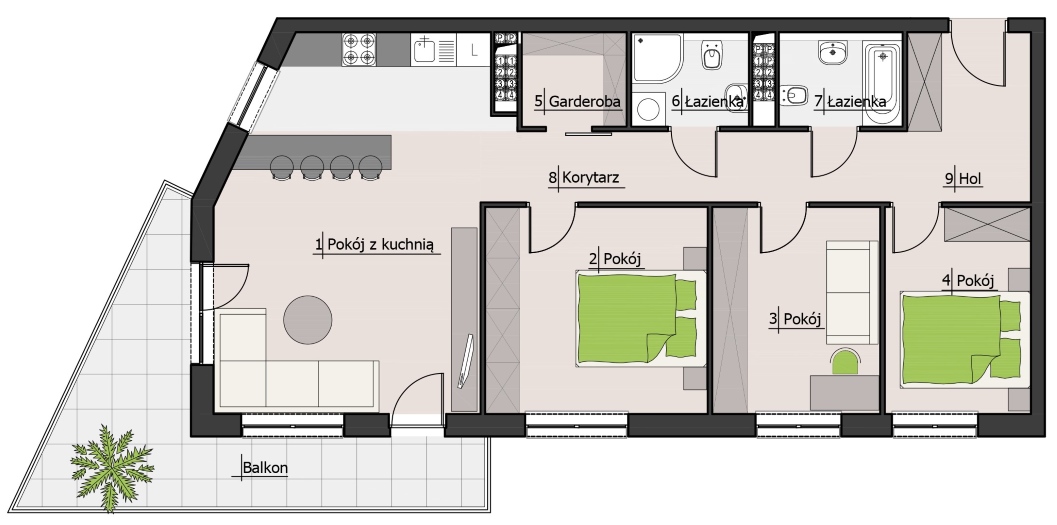 - 2 łazienki (3,45 m2 oraz 3,28 m2)