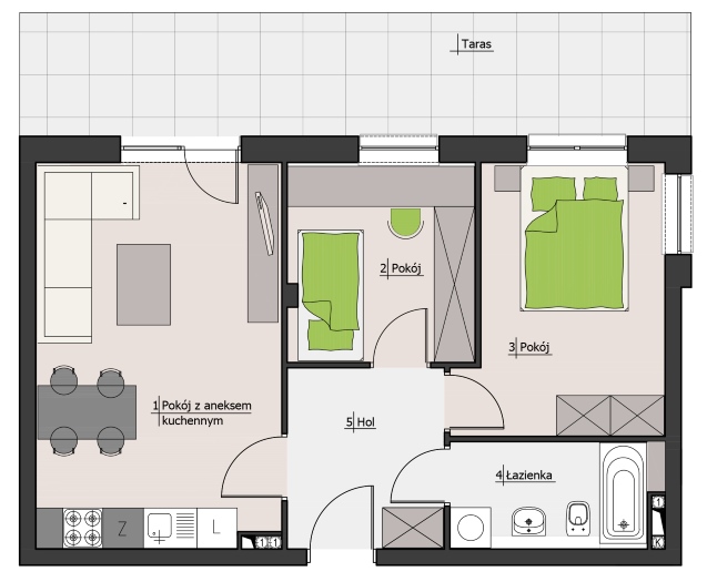 Nowoczesne mieszkanie z tarasem, stworzone z myślą o rodzinach, usytuowane w centrum Łodzi na osiedlu Nova Lipova (budynek B1).